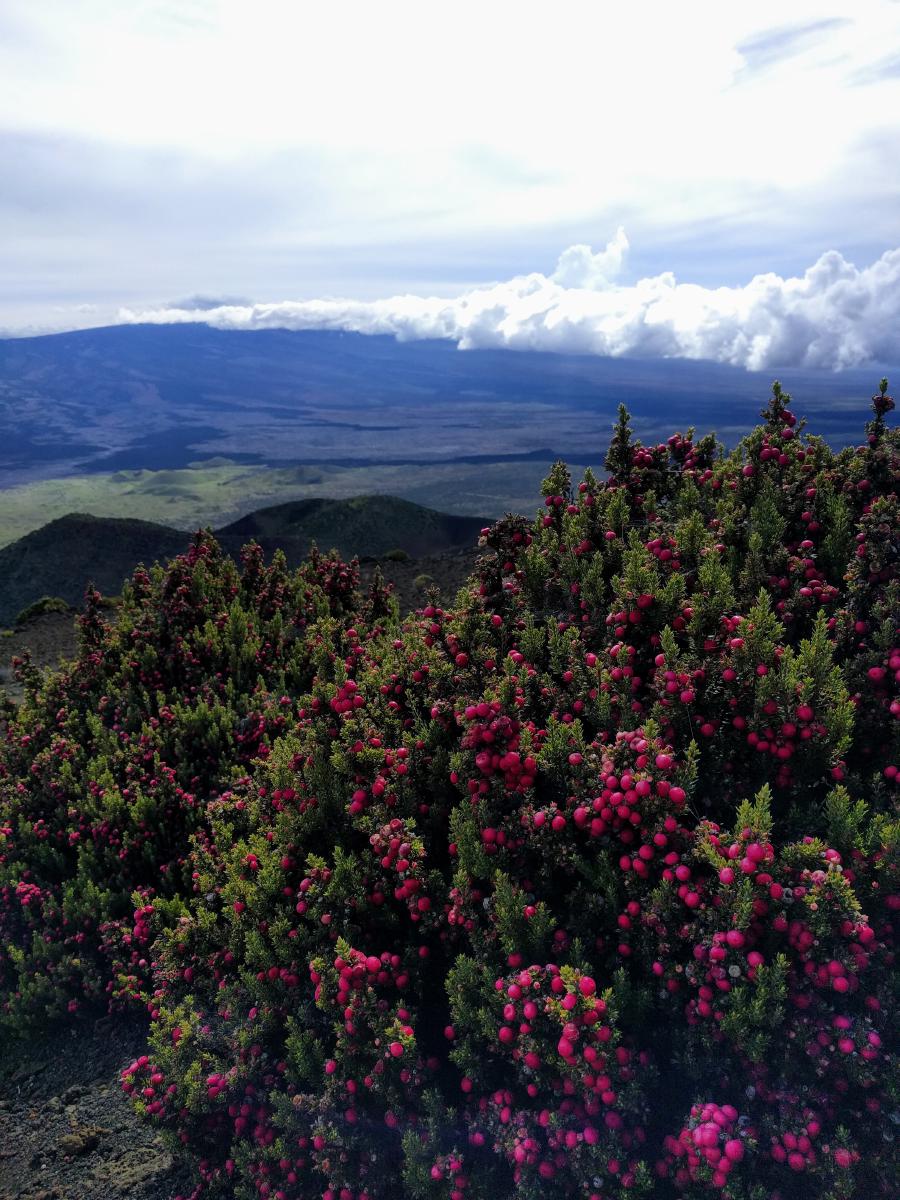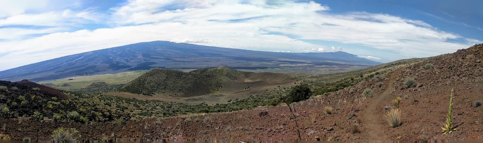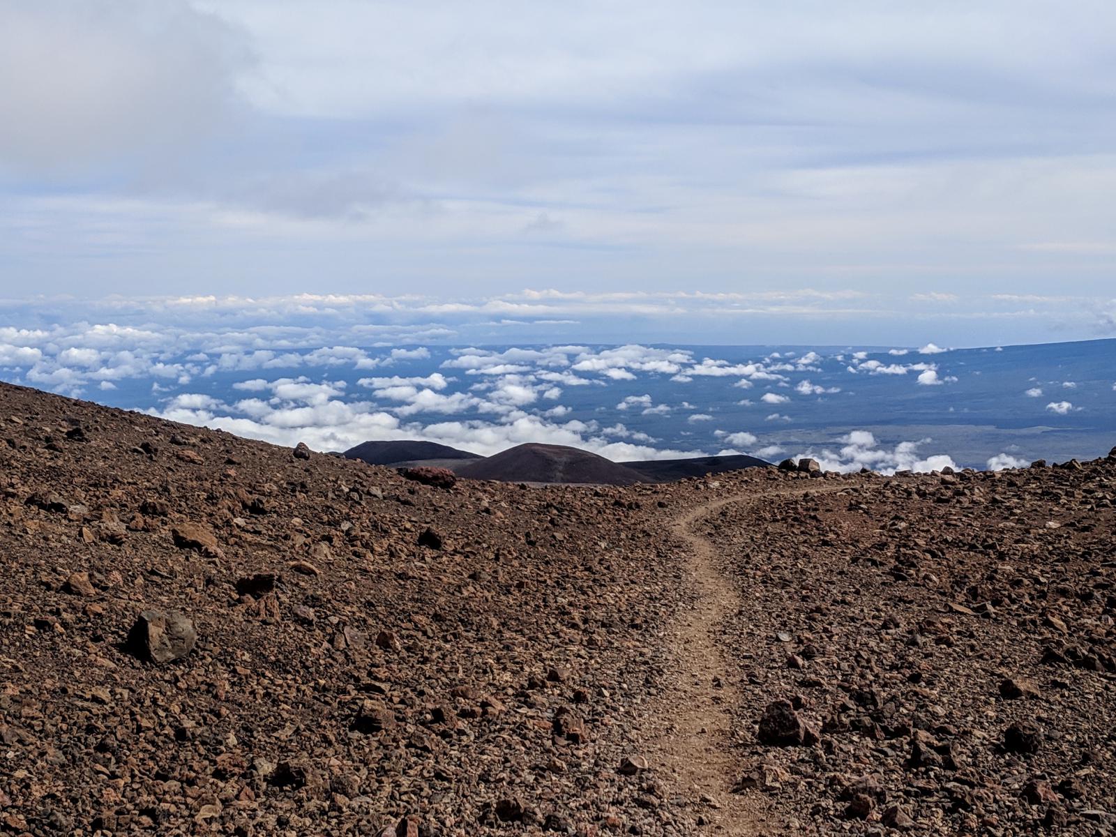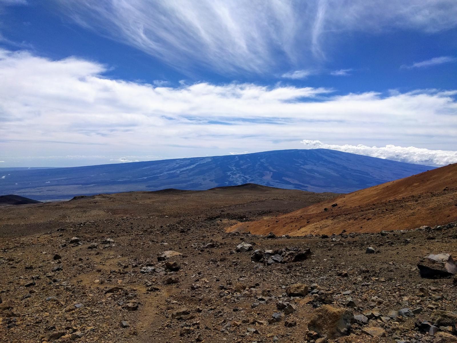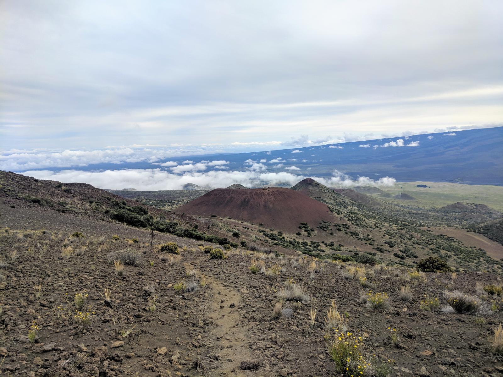 The path is pleasant singletrack, rapidly ascending out of the vegetation and into sandy and gravelly volcanic terrain. If it’s clear, there are excellent views of Mauna Loa looming expansively to the south, as well as the verdant saddle area between the two volcanoes. From the top, if it’s an extraordinarily clear day, you might catch some glimpses of Maui or other Hawaiian islands to the northwest.