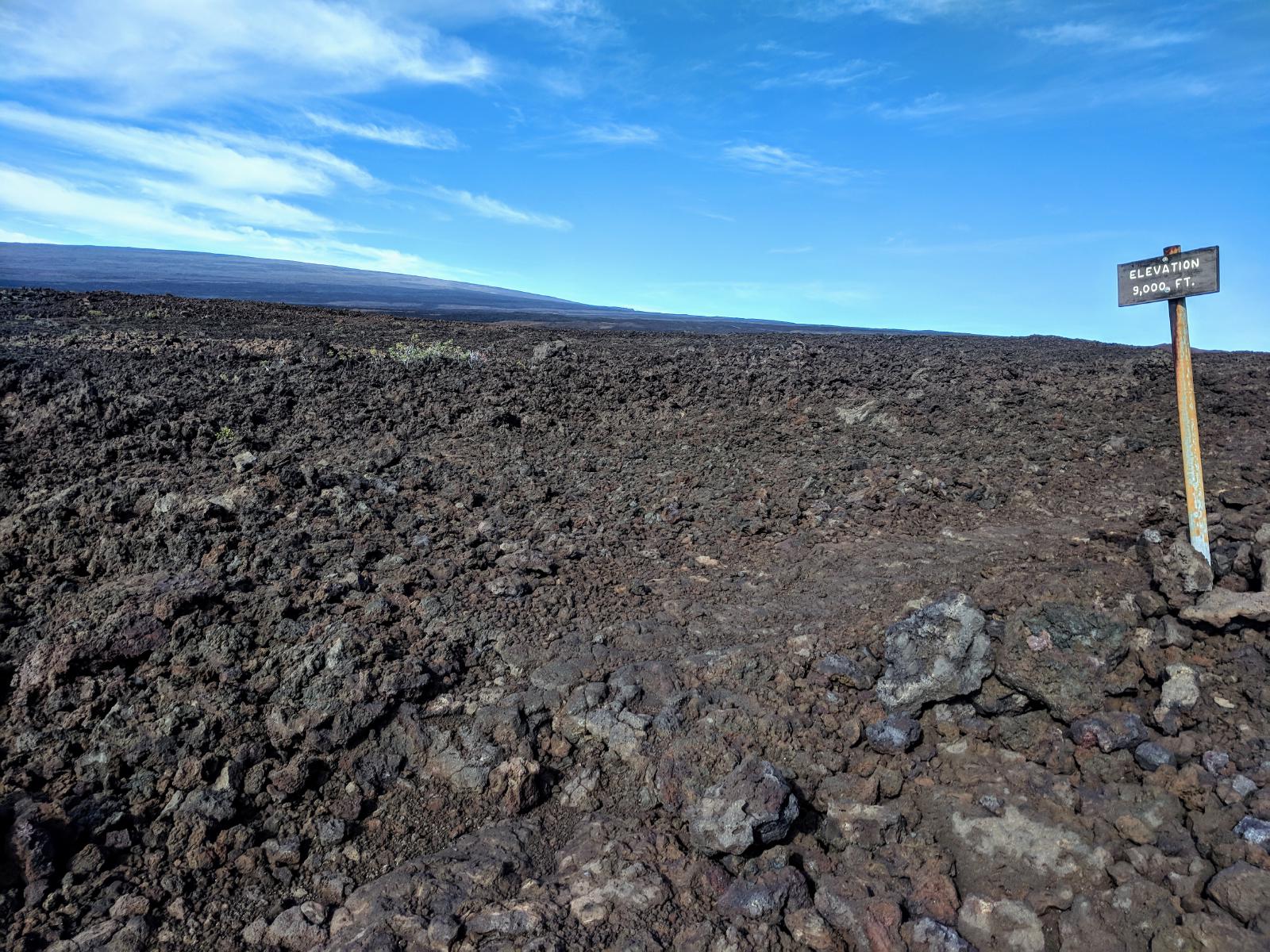 The route is indeed epic; and bears testament to the mountain’s name – Mauna Loa translates to “long mountain”. The shield volcano’s shallow aspect makes for a long climb. The Mauna Loa trail is the longest of 3 approaches to the summit (the Ainapo Trail and Mauna Loa Observatory Trail being the others), but also the most popular. The path steadily and nearly monotonically gains almost 6500’ over the 16 miles to the caldera, always with a mild grade. I found it to be a rather difficult grade for running – a steady enough and steep enough climb that I couldn’t run continuously, but shallow enough that I was never fully comfortable at a walking pace. I settled into a rhythm of light jogging punctuated by speed walking.