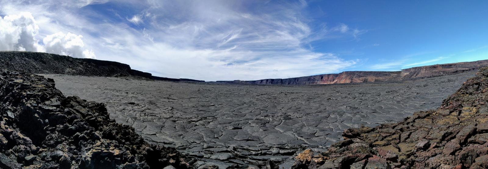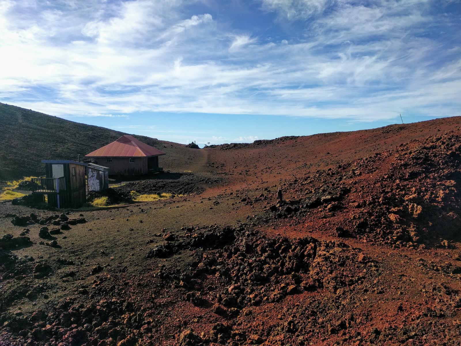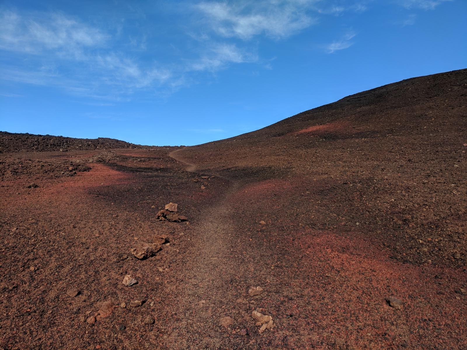 Around 4.5 hours in I reached the caldera, and followed the cairns across its crusted surface to peer down into the Lua Poholo pit and across the large central plain. I’d have loved to continue on to the summit (and figured 1 to 1.5 additional round-trip hours to do so based on my pace), but storm clouds were building to the east, and I worried about the descent. I turned around.