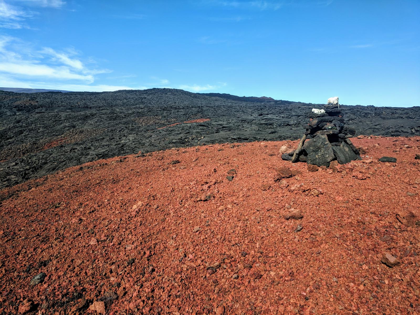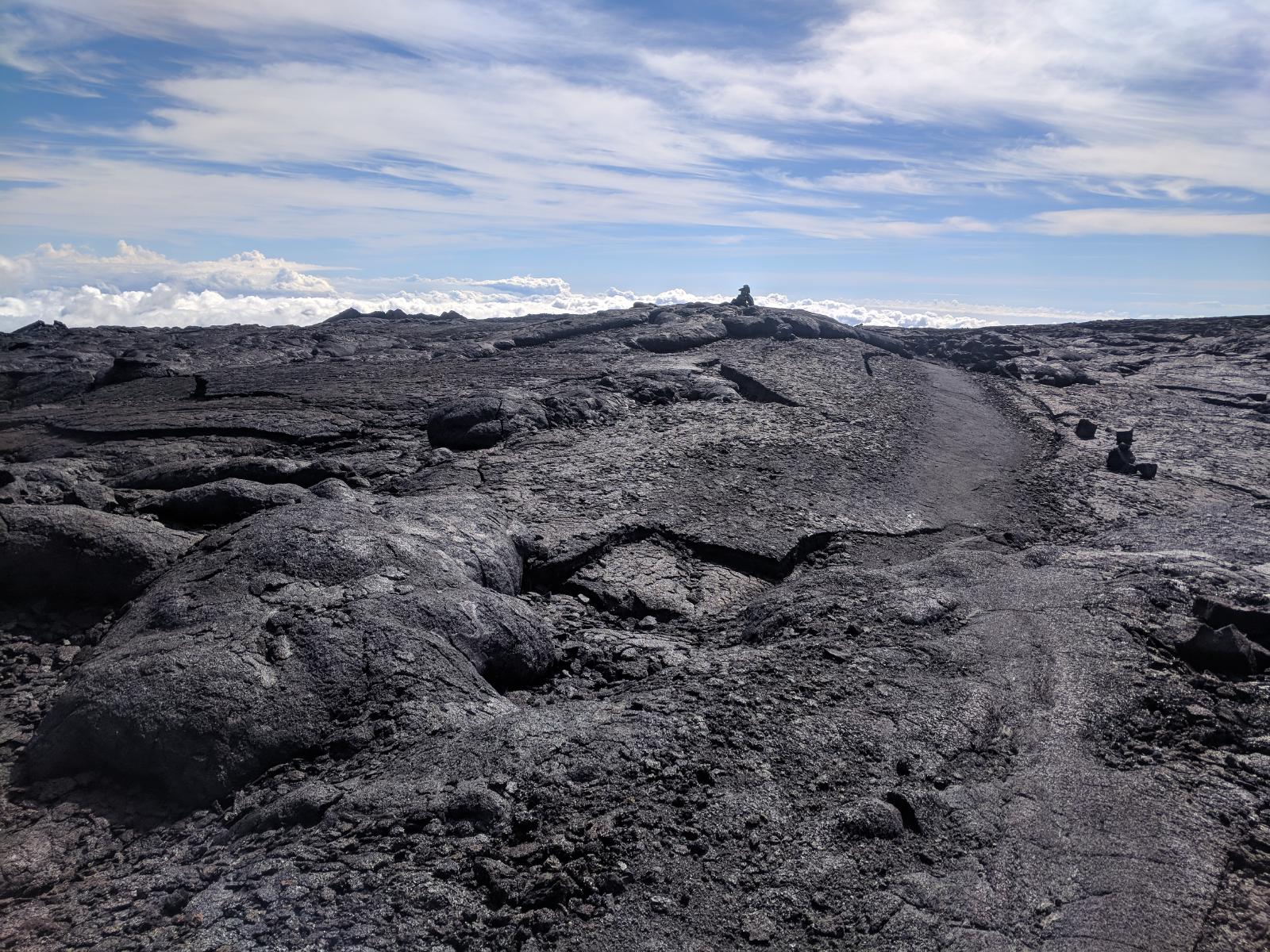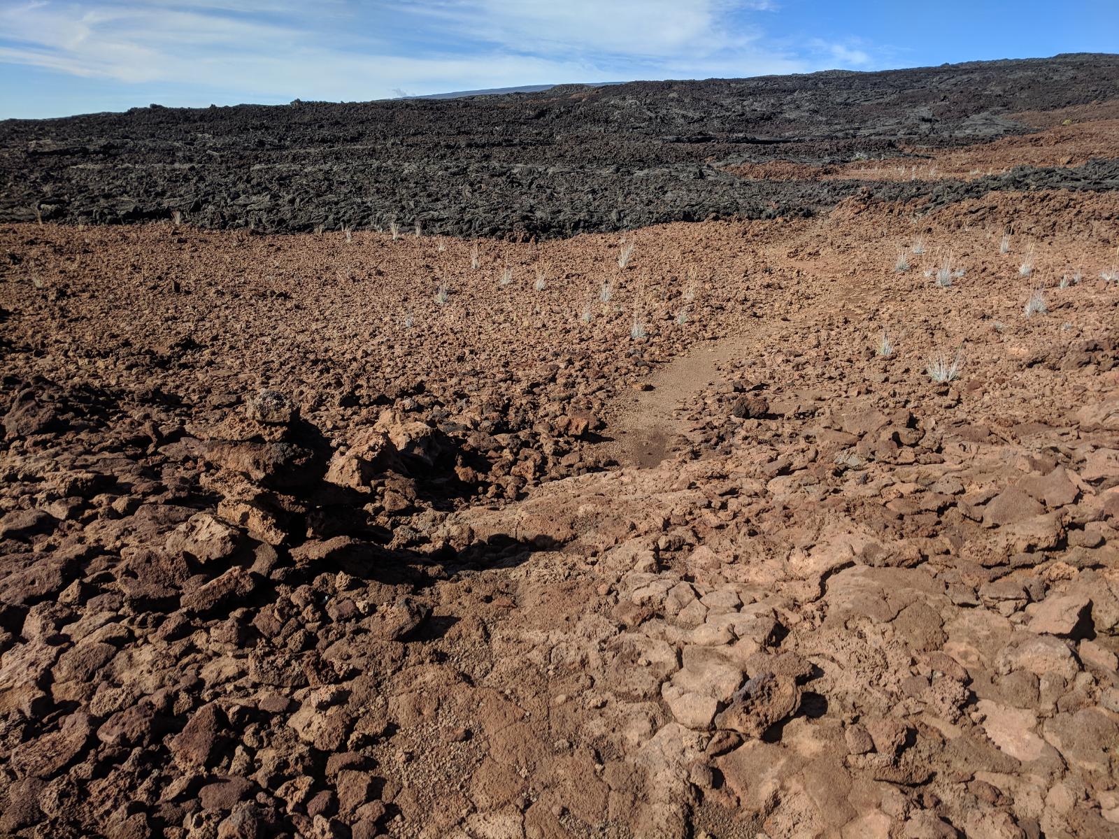 The surface is almost entirely rough lava (apart from a few sandy sections), but mostly of the smoother pahoehoe variety rather than the chaotic fractals of the a’a’ lava. This made the footing less treacherous, and the ample 4-5’ tall cairns were easier to spot among the smoother surroundings than trails with more a’a’. Still, the uneven ribbing of the tread required constant attention to avoid taking a spill, and slowed the rate of travel.
