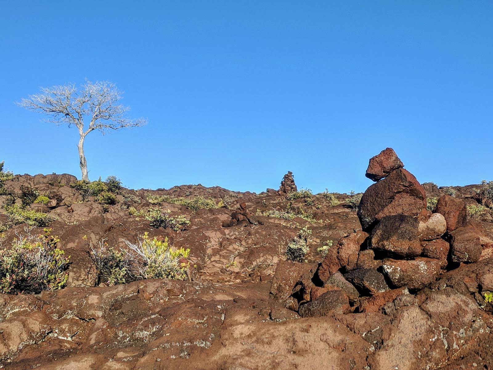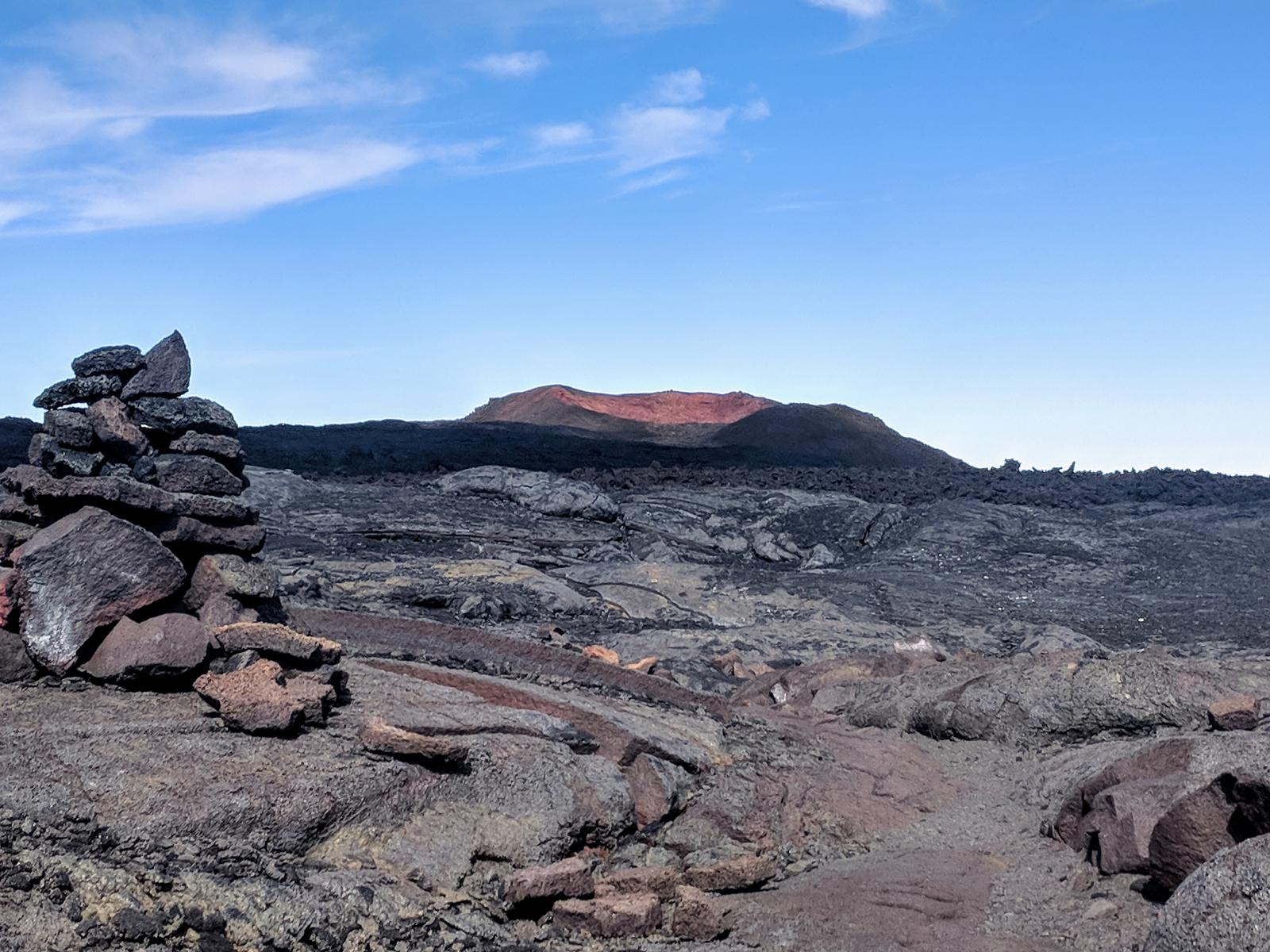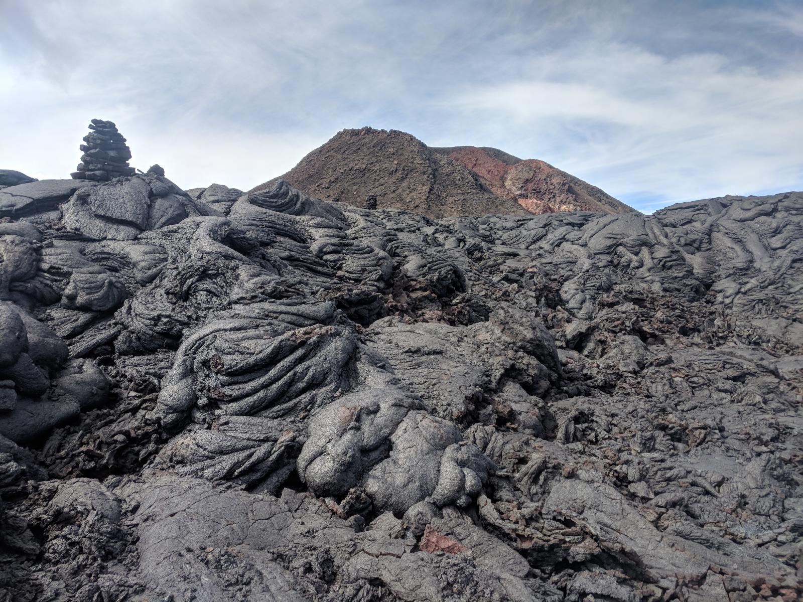 The surface is almost entirely rough lava (apart from a few sandy sections), but mostly of the smoother pahoehoe variety rather than the chaotic fractals of the a’a’ lava. This made the footing less treacherous, and the ample 4-5’ tall cairns were easier to spot among the smoother surroundings than trails with more a’a’. Still, the uneven ribbing of the tread required constant attention to avoid taking a spill, and slowed the rate of travel.