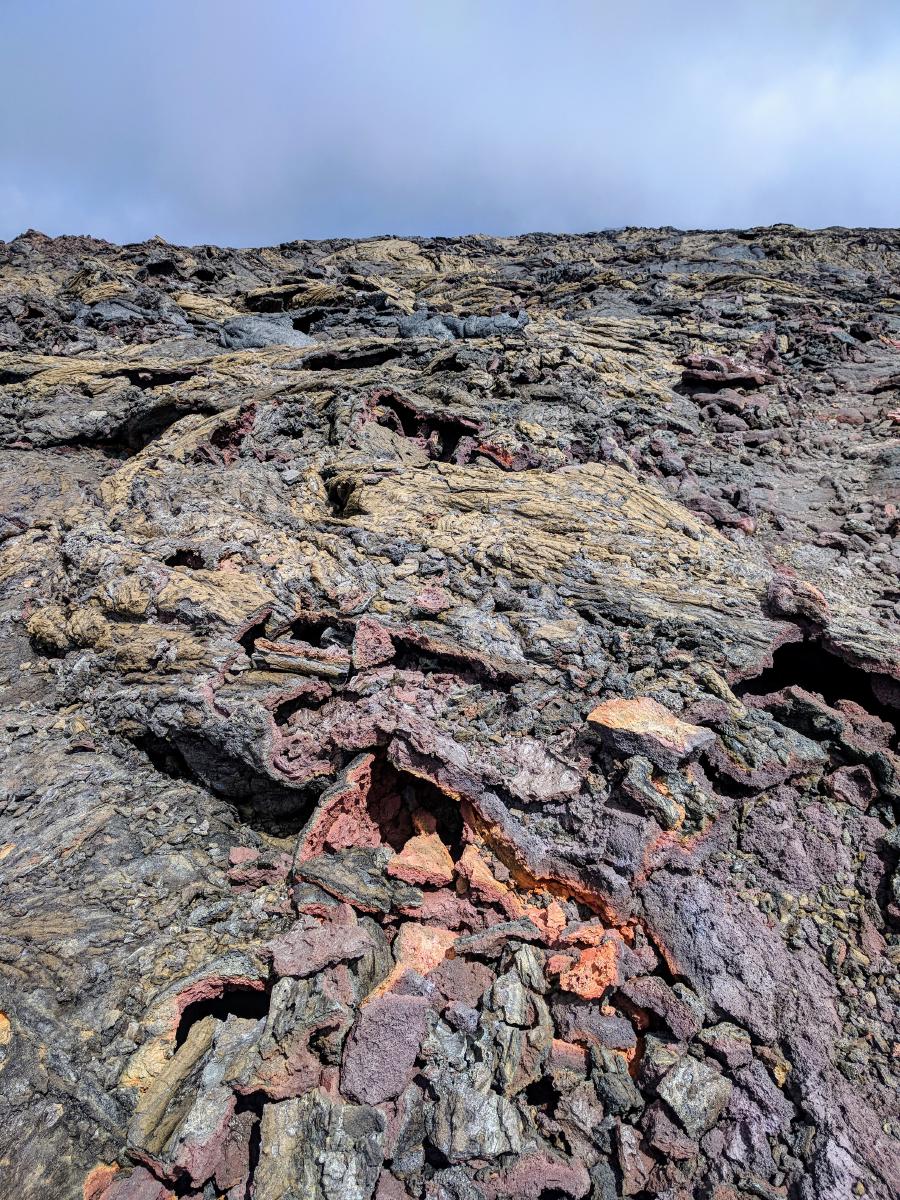 The variety of rock along the trail was staggering. Red hills, steaming vents, smooth fissures lined with “pele’s tears”, shiny rainbow surfaces, monstrous outcroppings, black cindercones, interfaces between varied flows with different textures, colors, and constitutions. I picked up football-sized rocks with shiny multicolored exteriors that felt as light as a tennis ball, and walked on surfaces that crunched like breaking glass under my feet. A short way after the red hill cabin were a pair of seemingly bottomless pits, lined in bright red. Otherworldly.