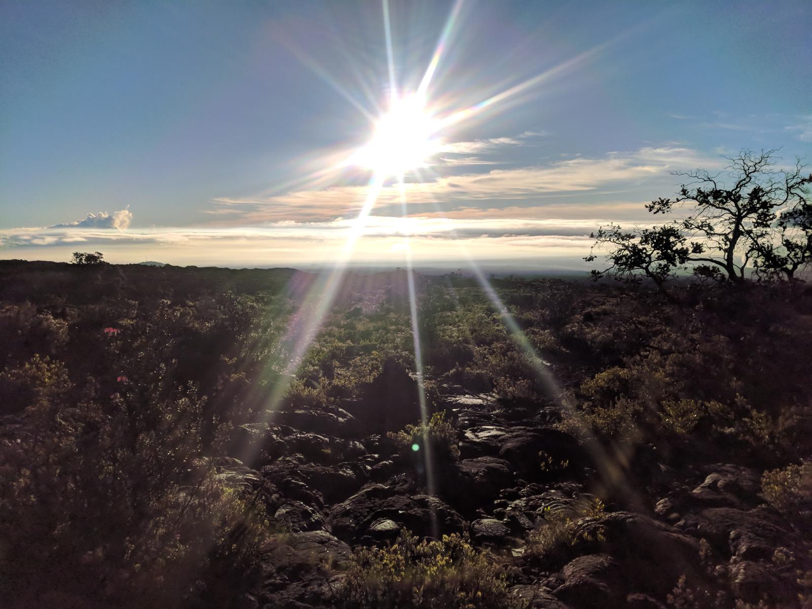 We got started well before dawn, targeting a first-light start. The sun was just peaking over the horizon behind Kiluea’s steam plume when we started up the trail. Goals for the day, in order of priority: (1) a safe trip, (2) reach the caldera, and (3) summit.