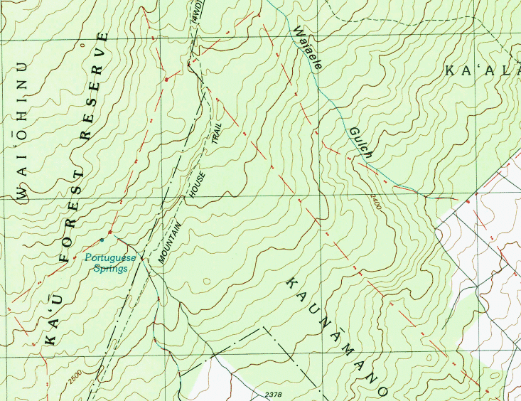 The route begins by passing through ranchland on the slopes of the mountain, before plunging into the forest around 2 miles in. A couple miles further, the road passes a locked gate for vehicles that is easy to step over. From there, the route climbs steadily until it terminates at an improved spring and piping system. Water from the springs here has been used for agricultural lands and small towns throughout Ka’u for hundreds of years. There are several smaller, more theoretical hunting routes that branch off of the Mountain House Road (including the purported path of the upper Hao Springs Road, and the 4wd road junction at 19.1288, -155.6112) but I didn’t explore these.