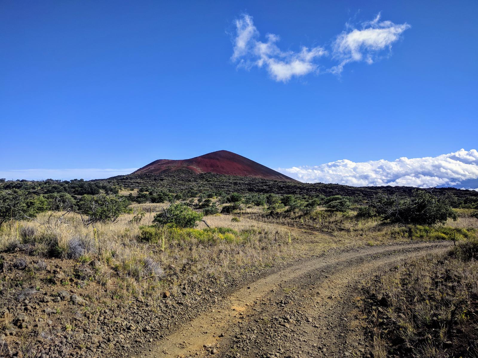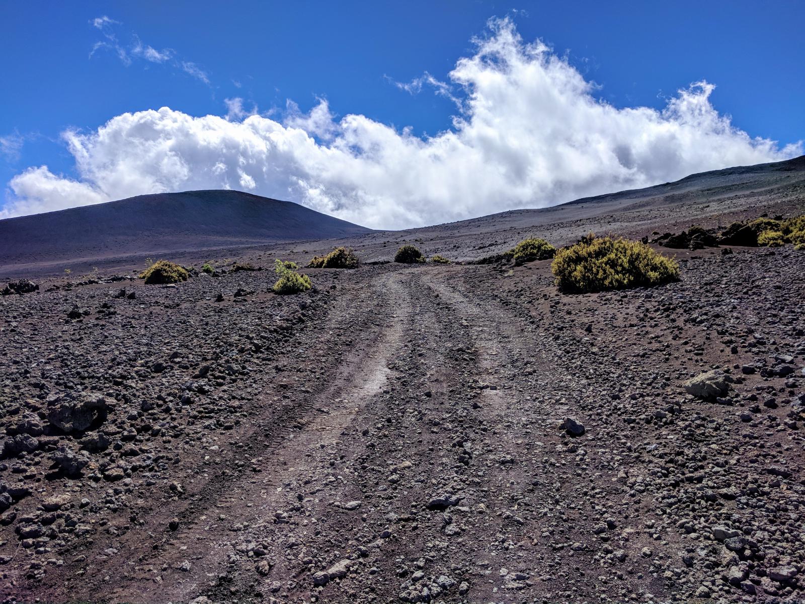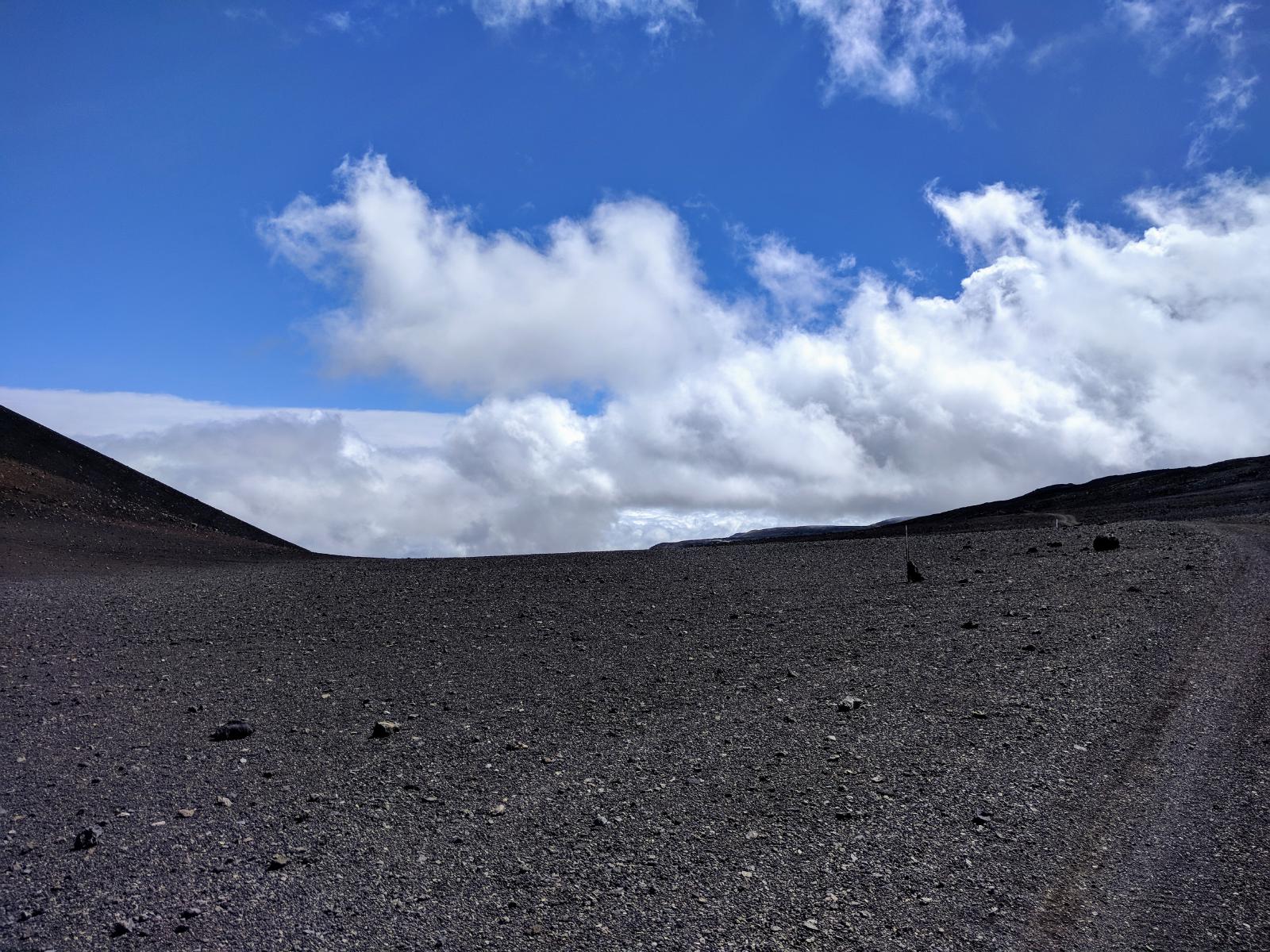 The road is fairly well maintained; the majority either packed sand or gravel. The first 15 miles climb through Māmane forests and shrubland. Keep an eye out for the critically endangered Palila honeycreeper which lives in this habitat (I was not lucky enough to see one). If the weather’s clear, you might be able to see Maui to the northwest. At 15mi, the path drops 1400’ to the base of the Pu’u Mali cindercone and restoration area, and then resumes the ascent with some brutal switchbacks and a 2600’ climb to the junction with the Umikoa Trail and Pu’u Kanakaleonui at mile 24. During this climb, the terrain passes from brush to moonscape, with sweeping vistas of grey, black, and red lava rock both up and down the volcano. The older lava from the extinct Mauna Kea volcano is more weathered and gravelly, in contrast with the sharper a’a’ found on the south side of the island. At around 28 miles, the shrubland returns, offering low trees and sandier soil for the remainder of the climb to the visitor’s center.
